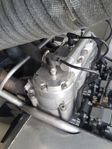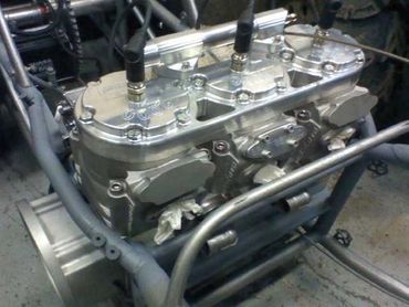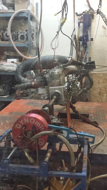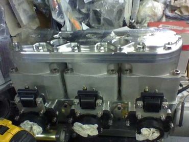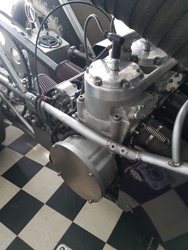 Robert Cote the CEO of The Mod Shop wanted to build an unspoken and unheard of engine for his dragster back in 2011. Some points that had to be achieved with doing a project like this was it had to be lightweight, compact, and make lots of horsepower. Going with a 2-stroke engine was a great way to make power while being compact and lightweight. Less parts to make and need for the inside of the engine. For the size of engine he wanted, everyone told him he couldn't build one and would not be able to get a crank to make it happen. When you tell Robert that something can't be done, he will go and prove you wrong. He planned out what size, how many cylinders he wanted. what type of fuel system he was going to use, also if this was a carbureted or fuel injected project. What kind of ignition system he was going to use, etc. He then custom machined a crank for the engine and pressed all the pieces together. Once the crank was built, we teamed up with Ralph at Split Second Performance to help with machining with their CNC Milling maching, Ralph got machining the crank cases and head out of a block of aluminum. We went with some blank casted cylinders since it was cheaper and the work for the bore size and Nicasil plating was already done. When we received the cylinders we ported to the specs we wanted to see out of them. We found Wiseco pistons that were already made to the bore size needed so we didn't need to custom make any pistons. The heads were then machined out of another block of aluminum to the compression ratio and squish clearance wanted. For the correct center spacing of each cylinder the arctic cat 900 carbs worked perfect, and it also allowed us to keep it de-tuned. The carbs were gone through and jets were changed for an approximate start. The flywheel housing was machined to use the 800 ski-doo mach z ignition system since it was made for a triple cylinder 2-stroke and incorporated electronic reverse. We also worked with Jaws Performance on this project to design a one of a kind custom pipes for the engine. Once assembled, it was thrown on The Mod Shop dyno and properly tuned. Jaws also had certain specs to properly tune the exhaust system. With everything working properly it put out 330hp and 222ft-lbs torque on 91 octane gas. There is a-lot of performance left in the engine but we kept it de-tuned so we could get everything figured out with the car and clutching. This primary clutch was used on a land speed record snowmobile. No other clutch out there could hold up to the abuse that big horsepower engines could put out. We knew this was a must for this project since its got unlimited amount of adjustments and it can handle the rpm power and torque of the engine. We have added a 100hp shot of nitrous on each cylinder when burning av-gas once we had clutching close.